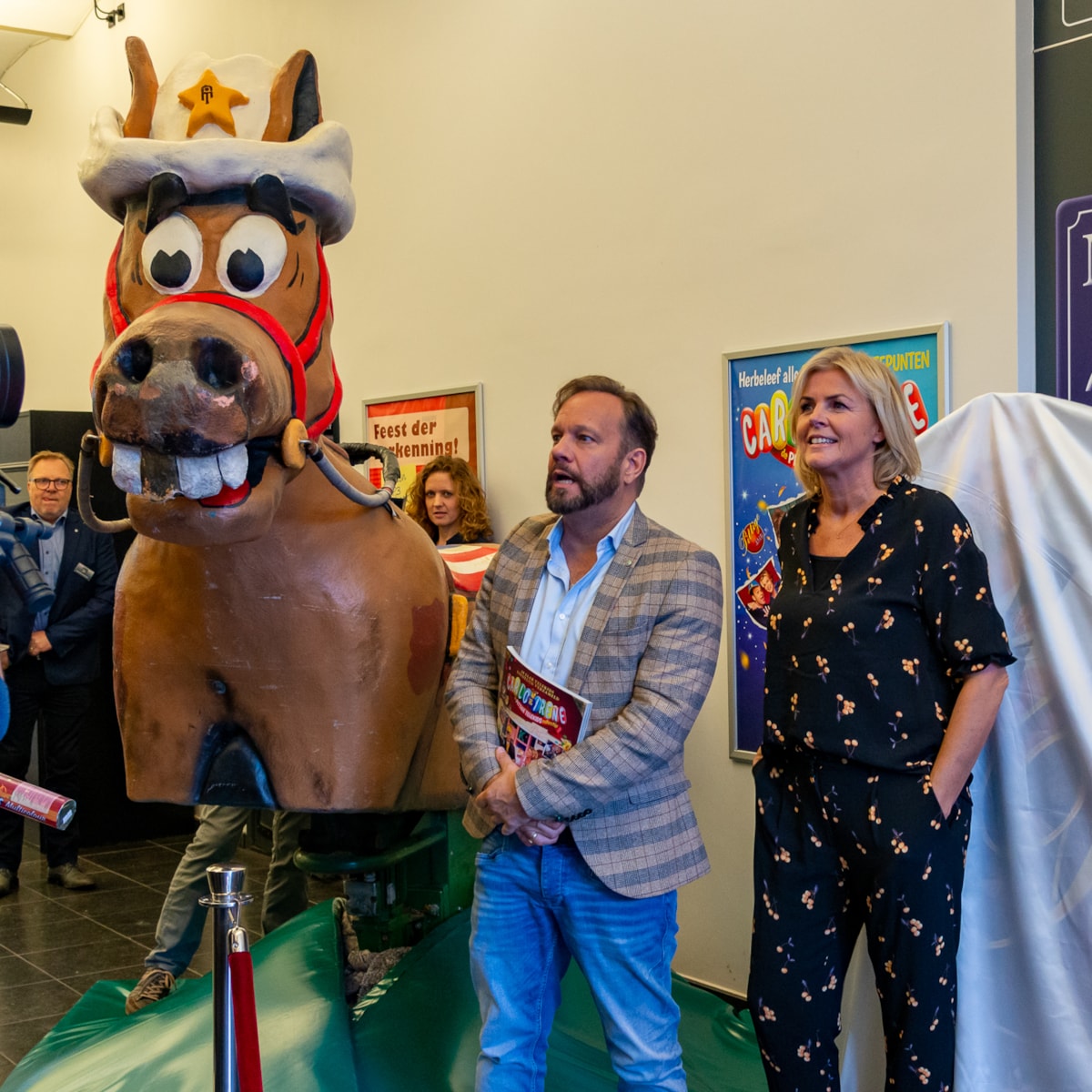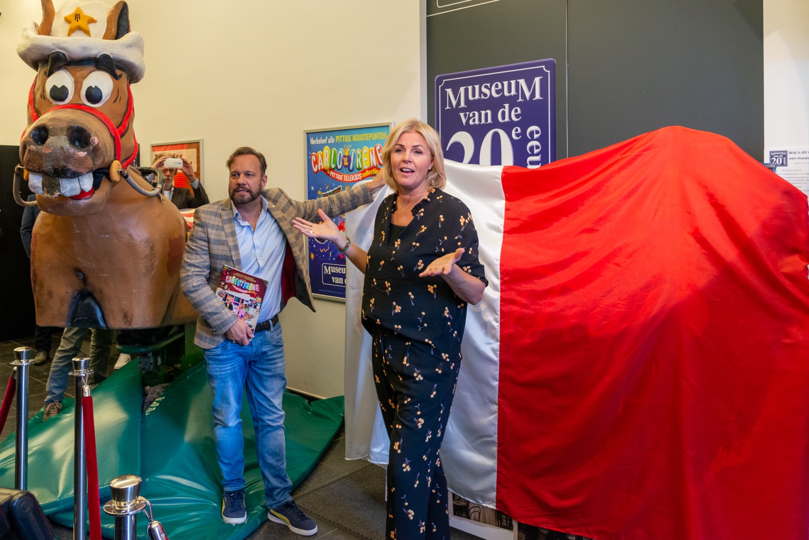 Uiteraard verliep ook de opening van de tentoonstelling en de boekpresentatie gezellig in de stijl van het voormalige kinderprogramma. Veel lachen en gek doen, maar ook veel bedankjes voor alle mensen die hadden meegewerkt. Materiaal voor de expositie kwam niet alleen van de zolders van Carlo en Irene maar er waren ook decorstukken in het land opgehaald. En het museum had enkele studio-decors tot in detail nagebouwd.
