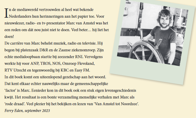 Van Amstel tot Noordzee is de titel van het boek over het bijzondere netwerk van RTV-presentator Marc van Amstel. Ooit woonde Marc in Hoorn, was hij DJ bij zeezender Radio Noordzee Internationaal en las hij nieuwsberichten voor het ANP en de Wereldomroep. Marc vond het tijd om een deel van zijn leven en kennissenkring vast te leggen. Zijn boek is exclusief verkrijgbaar bij het Museum van de 20e Eeuw: https://www.museumhoorn.com/BOEK-Van-Amstel-tot-Noordzee